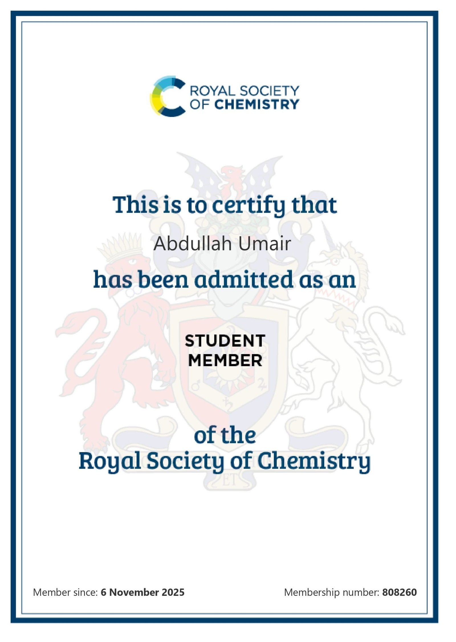 I’m officially a Member of the Royal Society of Chemistry (RSC) — one of the world’s leading professional bodies advancing the chemical sciences.