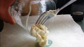 Allow the curds to settle down the whey and decant some of the liquid and filter off the remainder using the filter paper and funnel.