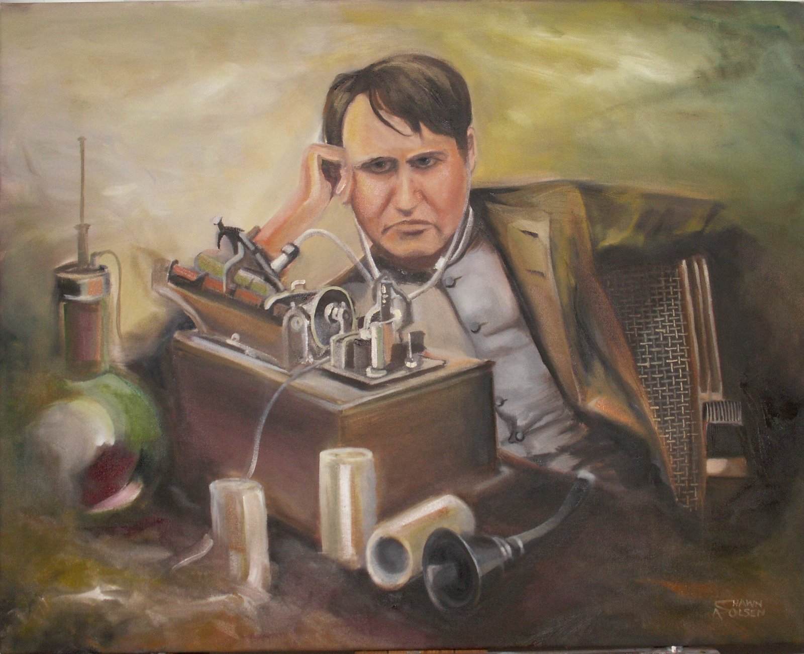 جب کر و سی ،سلنڈر نما مشینی پر زہ ایڈ یسن کے پا س لے کر آ یا تو پو چھا کہ یہ کیا ہے۔ ایڈ یسن نے بلا ارادہ کہا اوہ!یہ مشین بو لے گی۔ اس نے قلعی کے ورق کو سلنڈر کے گر د لپیٹا میر ی! چھ ٹا بھڑ کا بچہ ر کھتی ہے۔ اس نے یہ الفا ظ مشین کے ما ؤ تھ پیس میں بو لے ۔مشین نے ایڈ یسن کے الفاظ د ہر ا دیئے۔کرو سی کا چہرہ حر ت سے سفید ہو گیا۔ ایڈ یسن خو د بھی حیرا ن رہ گیا ۔