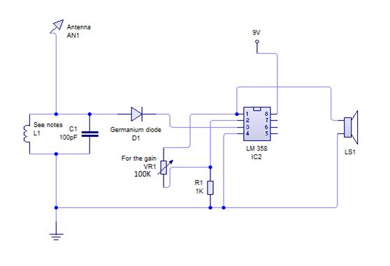 Build the rest of the circuit preferably on a breadboard first and connect the inductor you made previously. Connect a wire from your batteries ground to a metallic piece around your house: a sink, a radiator etc. The antenna should be 15-20 ft and should be hanging from the window or a high place. The longer the antenna the more channels you’ll be able to receive. Tune the circuit by sliding your wire coil in and out of the ferrite rod, this must be done slowly. This is a simple circuit depending on your location you’ll be able to tune to 3-5 channels. You can control the volume with the variable resistor.