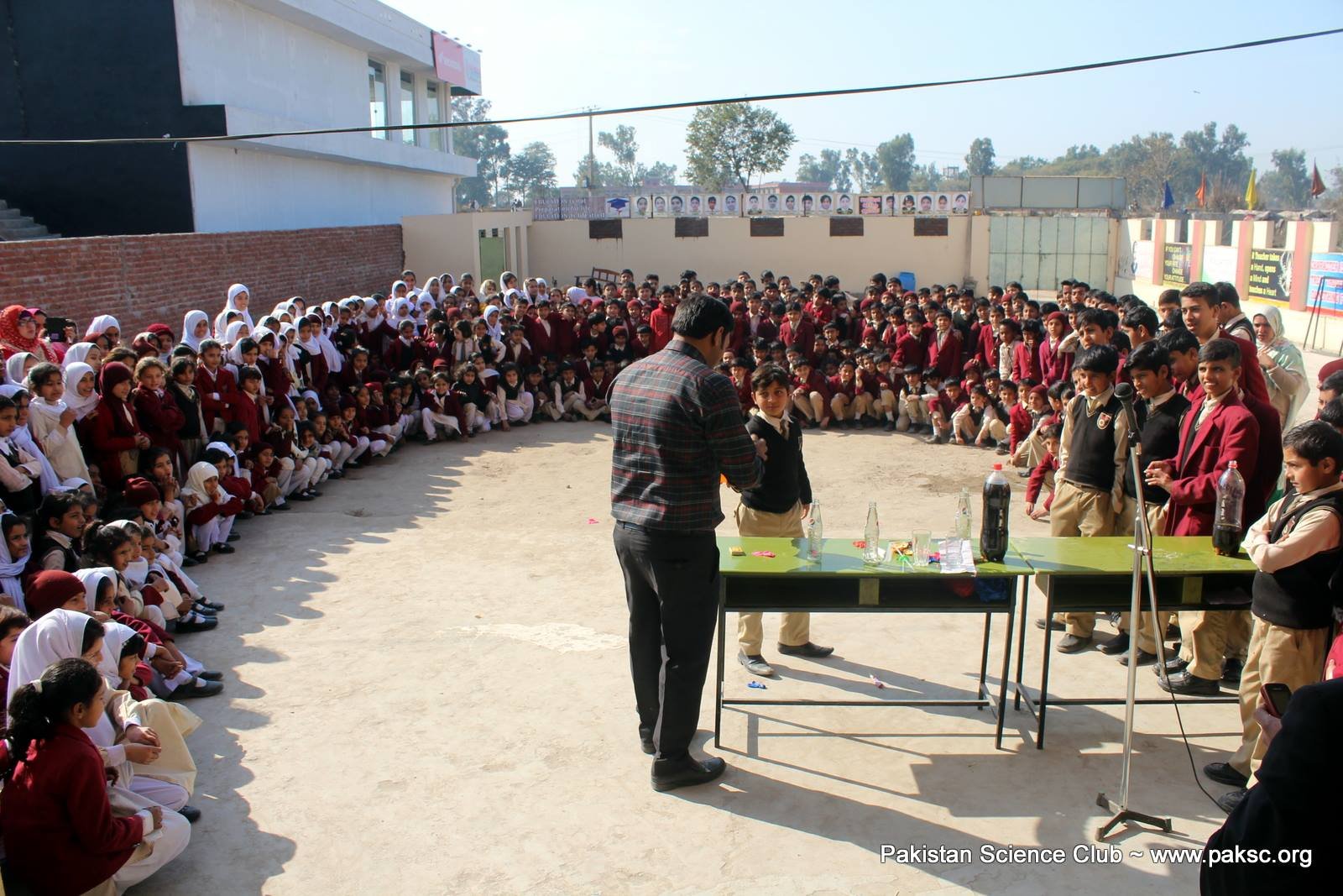 Fun science activities at The Knowledge school Hussain campus: Pakistan Science Club President Mr. Abdul Rauf demonstrate science magic in front of hundreds of students