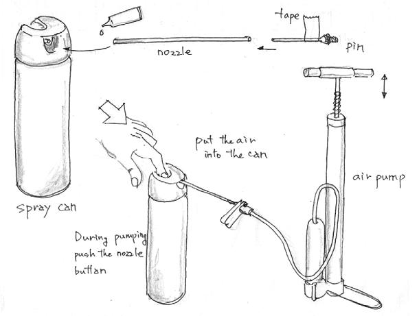 - The air is put into the spray can enough by the air pump. The spray button is pushed during pumping.